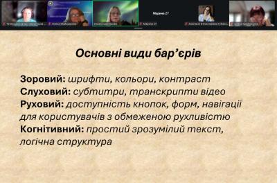 В епоху розвитку цифрових технологій питання цифрової безбар’єрності набуває все більшої актуальності. Як створювати інклюзивний контент, який буде зрозумілим для кожного користувача? Що таке універсальний дизайн? І що потрібно враховувати при розробці інформаційних продуктів? Про це, і не тільки, говорили під час вебінару «Цифрова безбар’єрність: як зробити навчання доступним для кожного учня. Що таке інклюзивний контент?», який провели для освітян – слухачів КУ «Центр професійного розвитку педагогічних працівників» ХМР фахівці бібліотеки Донченко Тетяна та Шестакова Оксана.
